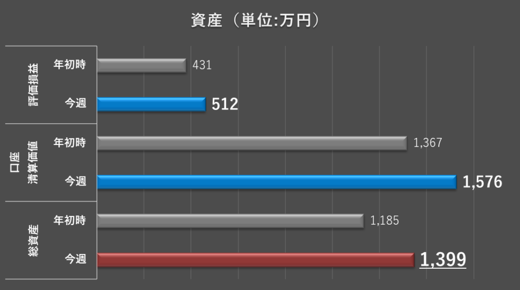 今週も、評価損益、口座清算価値、総資産のすべてにおいて、過去最高額更新となりました。この結果に慢心することなく、取引方針に則り冷静に取引していきたいと思います。